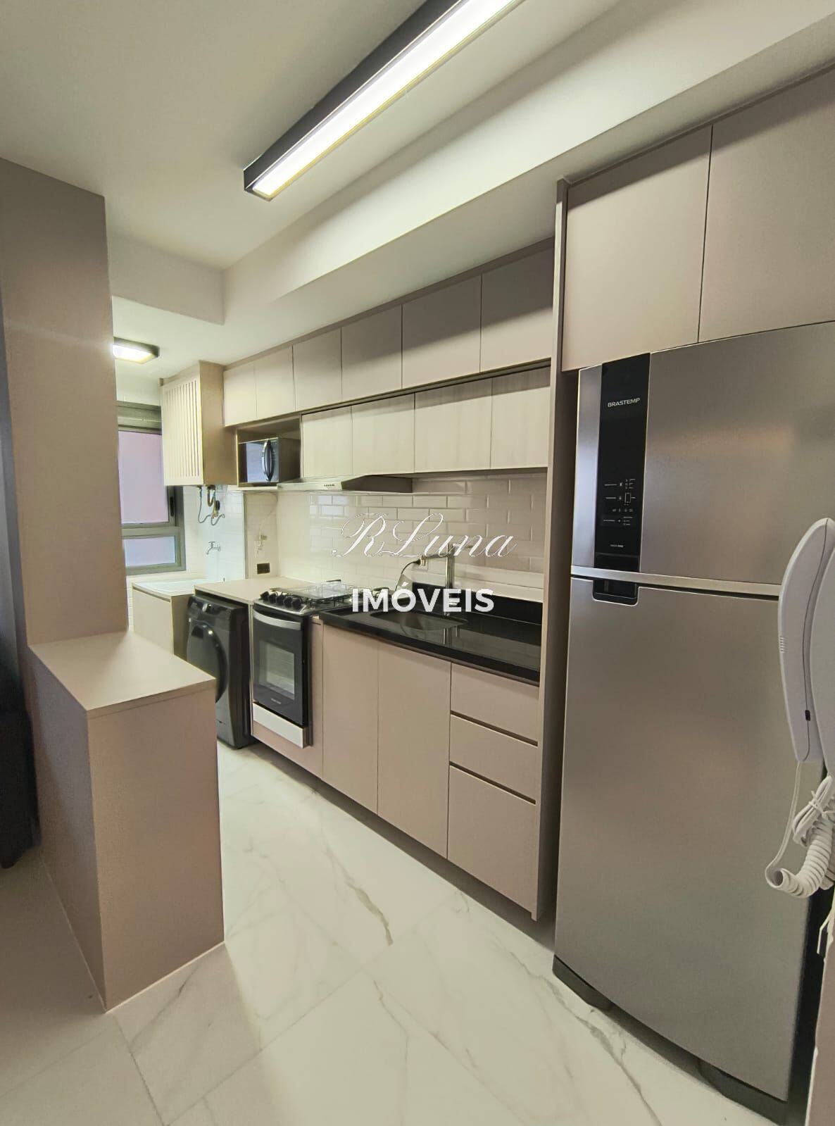 Cozinha integrada e completa com geladeira, micro-ondas e fogão.