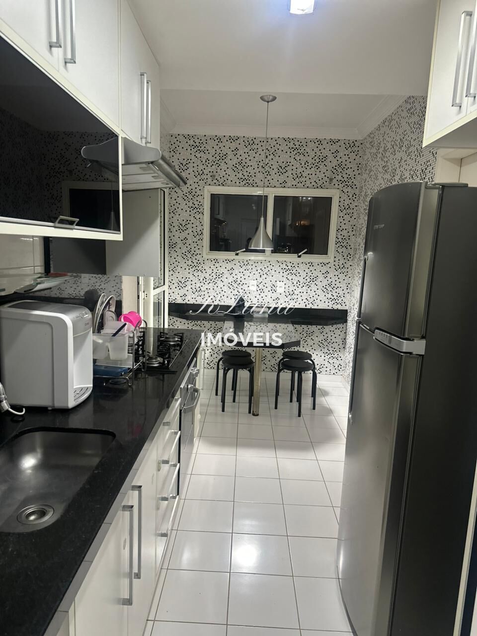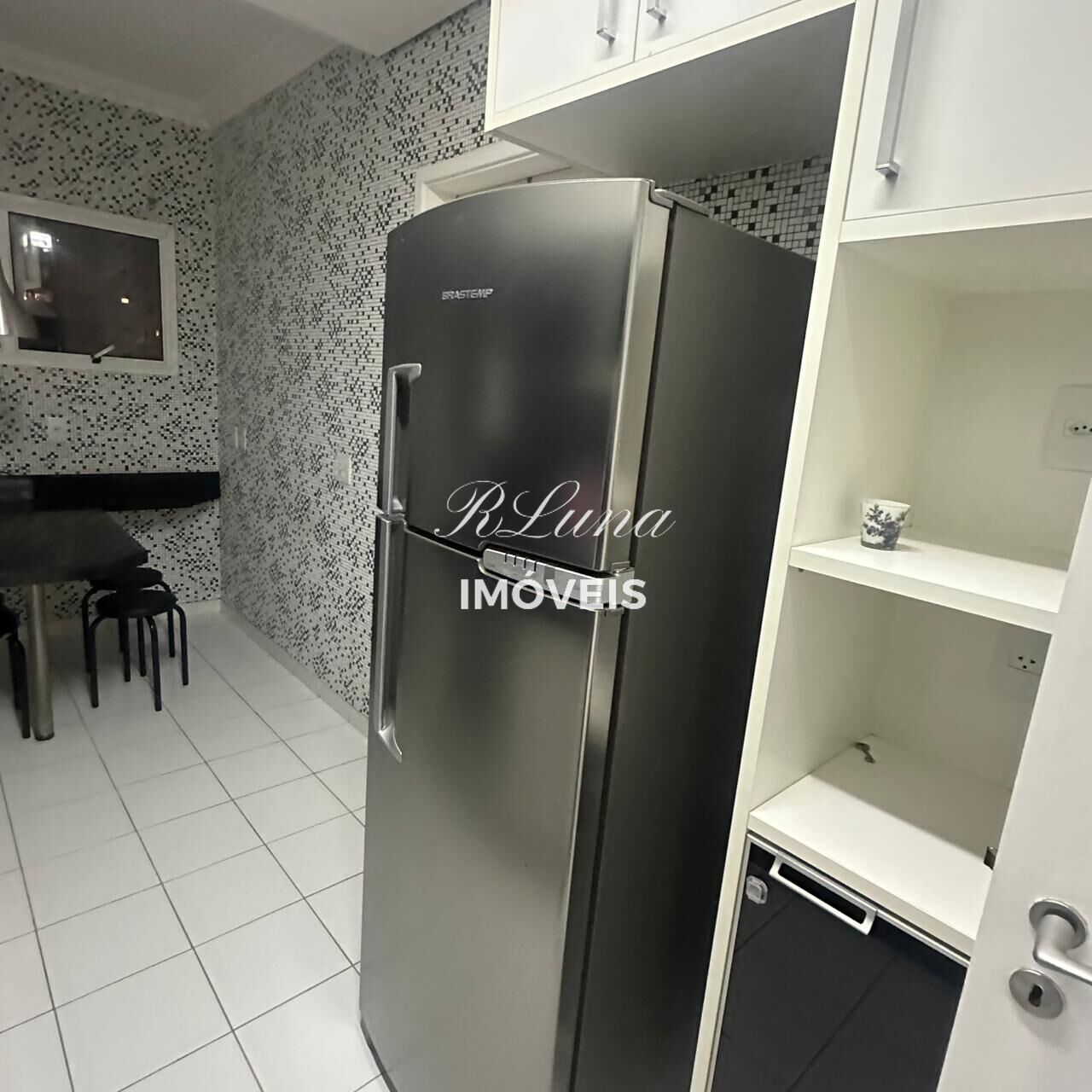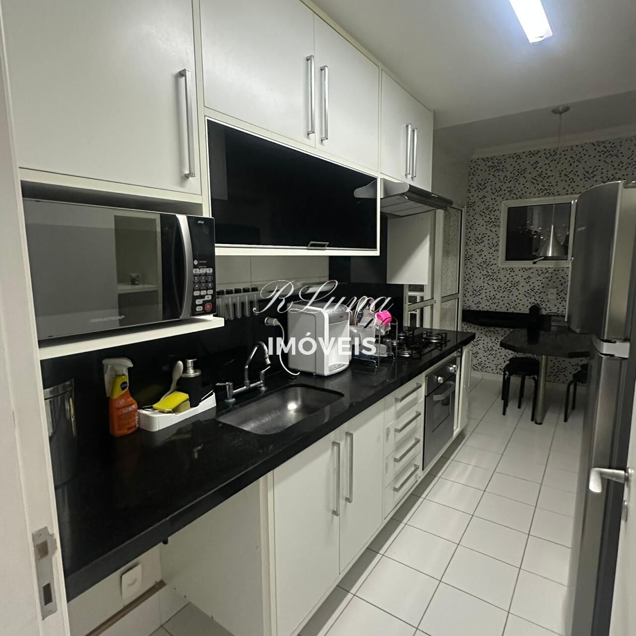 Cozinha completa de armários com geladeira, cook-top, forno embutido, micro-ondas , mesa e cadeiras